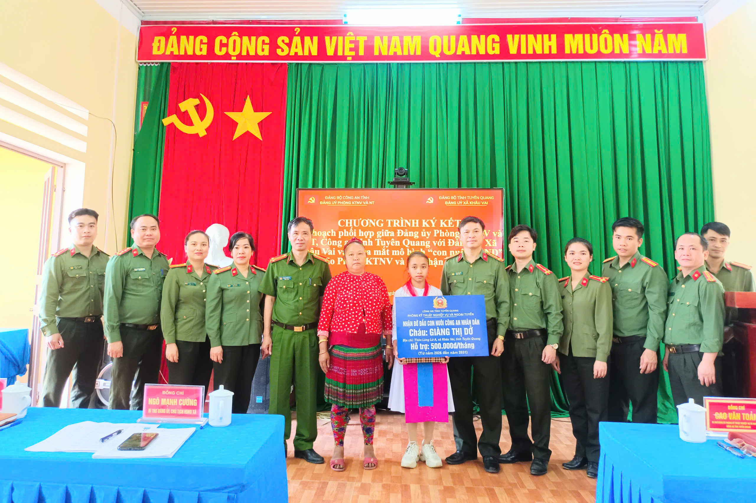 Ngay sau buổi lễ ký kết Kế hoạch phối hợp, hội nghị đã công bố Quyết định triển khai mô hình “Con nuôi Công an nhân dân” do Phòng KTNV&NT nhận đỡ đầu với cháu Giàng Thị Dở, sinh ngày 7/9/2013, thường trú tại thôn Lũng Lừ A, xã Khâu Vai, cháu đang học tập tại Trường Phổ thông dân tộc bán trú Tiểu học và THCS Lũng Pù. Cháu Dở là con mồ côi cả cha lẫn mẹ, có hoàn cảnh đặc biệt khó khăn. Thông qua mô hình, lực lượng Phòng KTNV&NT Công an tỉnh không chỉ hỗ trợ về vật chất mà còn quan tâm, động viên tinh thần, định hướng lối sống, giáo dục ý thức chấp hành pháp luật cho em. Qua đó, giúp em có thêm điều kiện học tập, rèn luyện và phát triển toàn diện hơn.