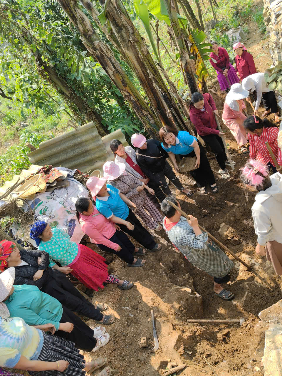 Cán bộ Hội LHPN xã và chị em hội viên phụ nữ trong thôn tham gia giúp gia đình chị Vừ Thị Dính tạo mặt bằng xây dựng nhà vệ sinh.